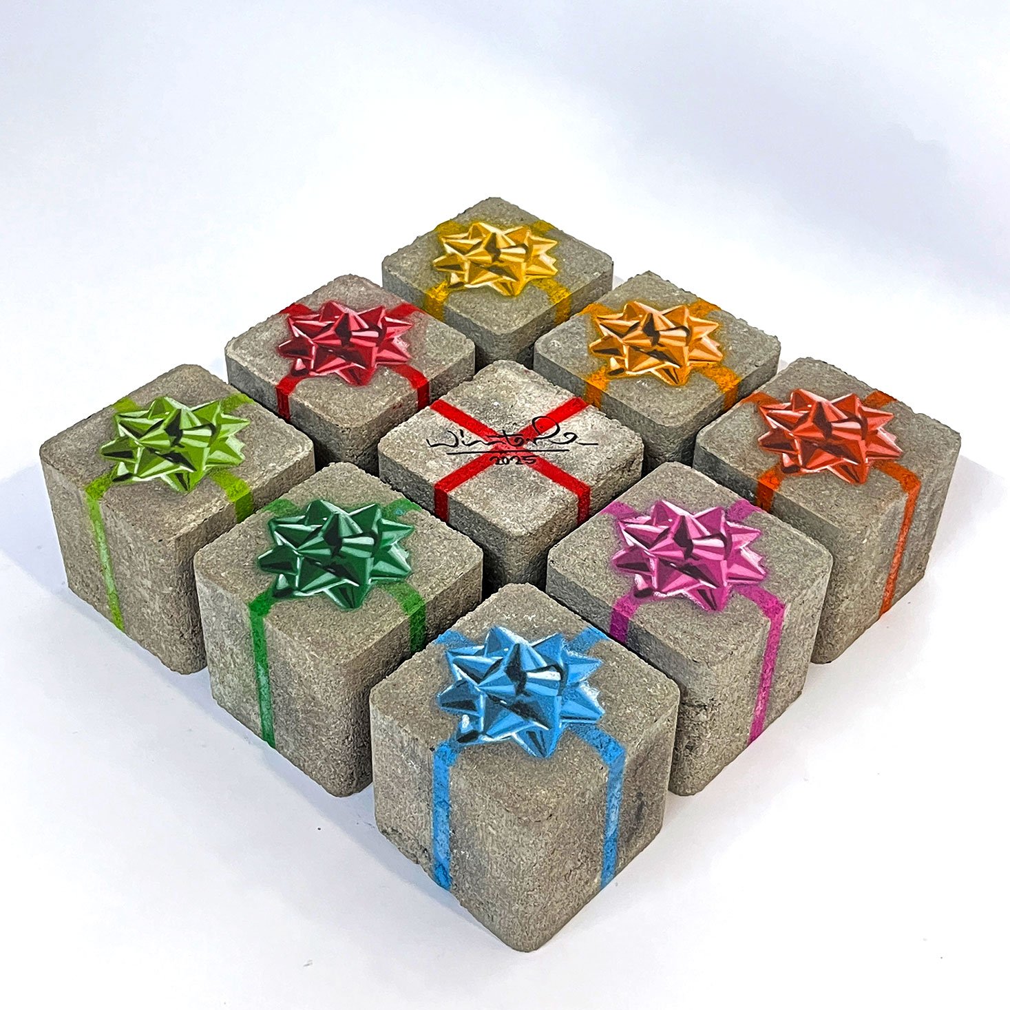 An 8×8×8cm cube. spray paint on concrete paving stones. Hand-painted and available in several colors. Open Edition 2025.